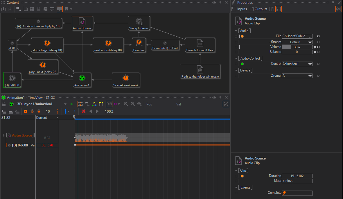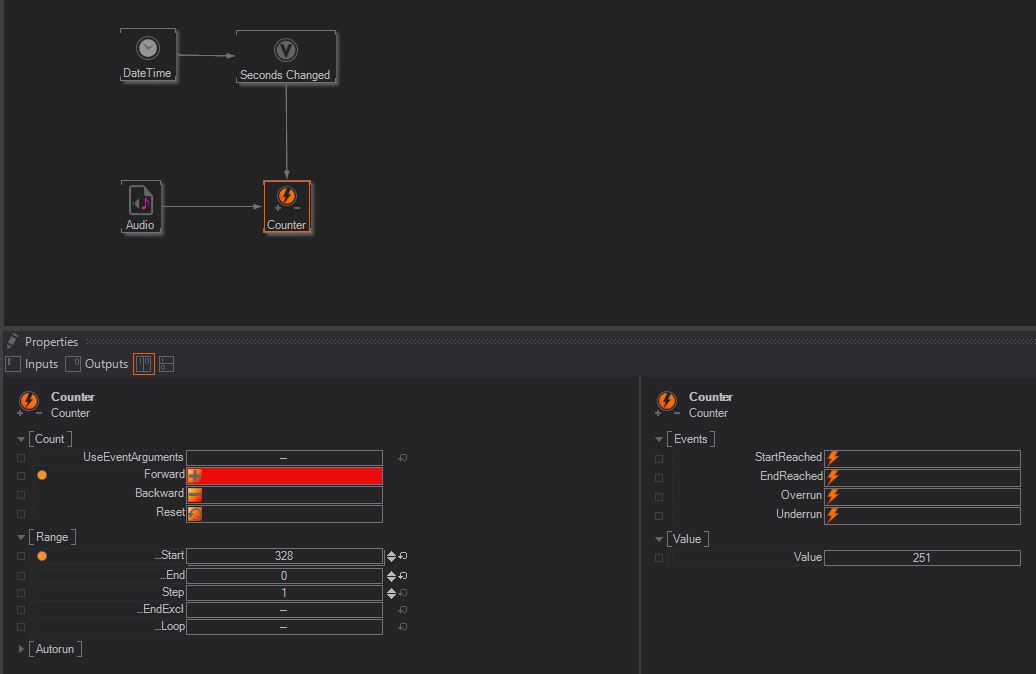 I like it. Good and simple solution.Total-Image wrote:I found a solution by using the DateTime node and bind the "seconds" property to a "variable" node. The "changed" event of the "variable" node triggers the "forward" (or backward) property of a "counter" node and the "start" (or end) value to the duration of the audio clip node..... See attachment