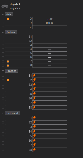 As it is now there are (X,Y,Z) properties where X and Y control the left analog stick (X would be the horizontal values from -1 to 1, and Y is the vertical values from -1 to 1). So far so good, but the Z output for some reason controls the Horizontal value of the right analog stick from -1 to 1 and there are no controls for the vertical values.
