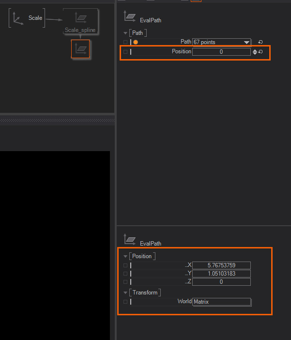 5. The EvalPath will output XYZ position and a Worldmatrix. Both could be used to animate Objects along the path, you can use the Position Value to define the position along the path