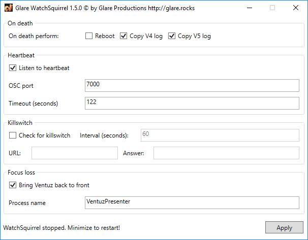 The WatchSquirrel is a useful tool when dealing with Ventuz-based installations. It provides watchdog functionality and will reboot the machine in case of a problem. It also helps with logging and focus loss and provides a mechanism to reboot the machine remotely without the need for any remote tool, simply by using a killswitch.