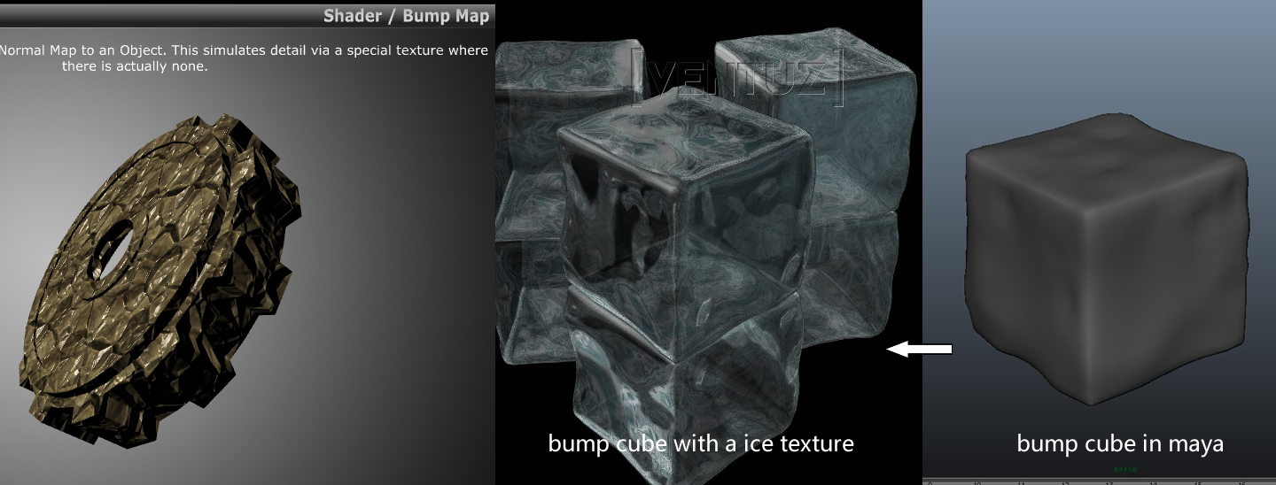 I have a tried that the Bump Map shader in ventuz, however, the given wheel sample works only the texture is opaque.Finally i have to make a 'bump' model in maya and give ice texture to be done in Ventuz.So there are many transparent object model in usual,like glass cup, cola bottle...could it be said that I gotta make the complex surface model for every object which like i said ?