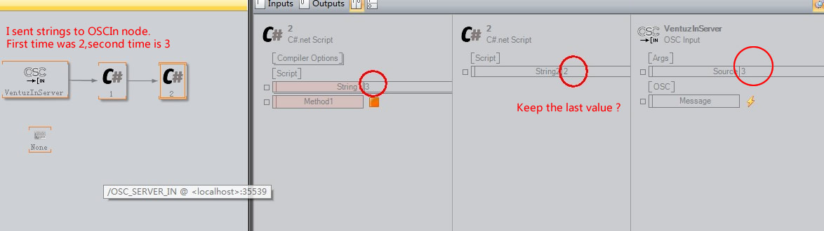 I try a the same behaviour by the keyboard node.The time of passing value is synchronous with the event trigger.But OSCIn node is asynchronous,which cause my presentation show the delayed value when OscIn triggered. : (