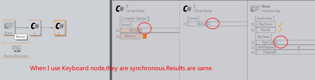 I had a test on OSC and Keyboard node for the same C# passing structure.OSC made values different and Keyboard node works well.