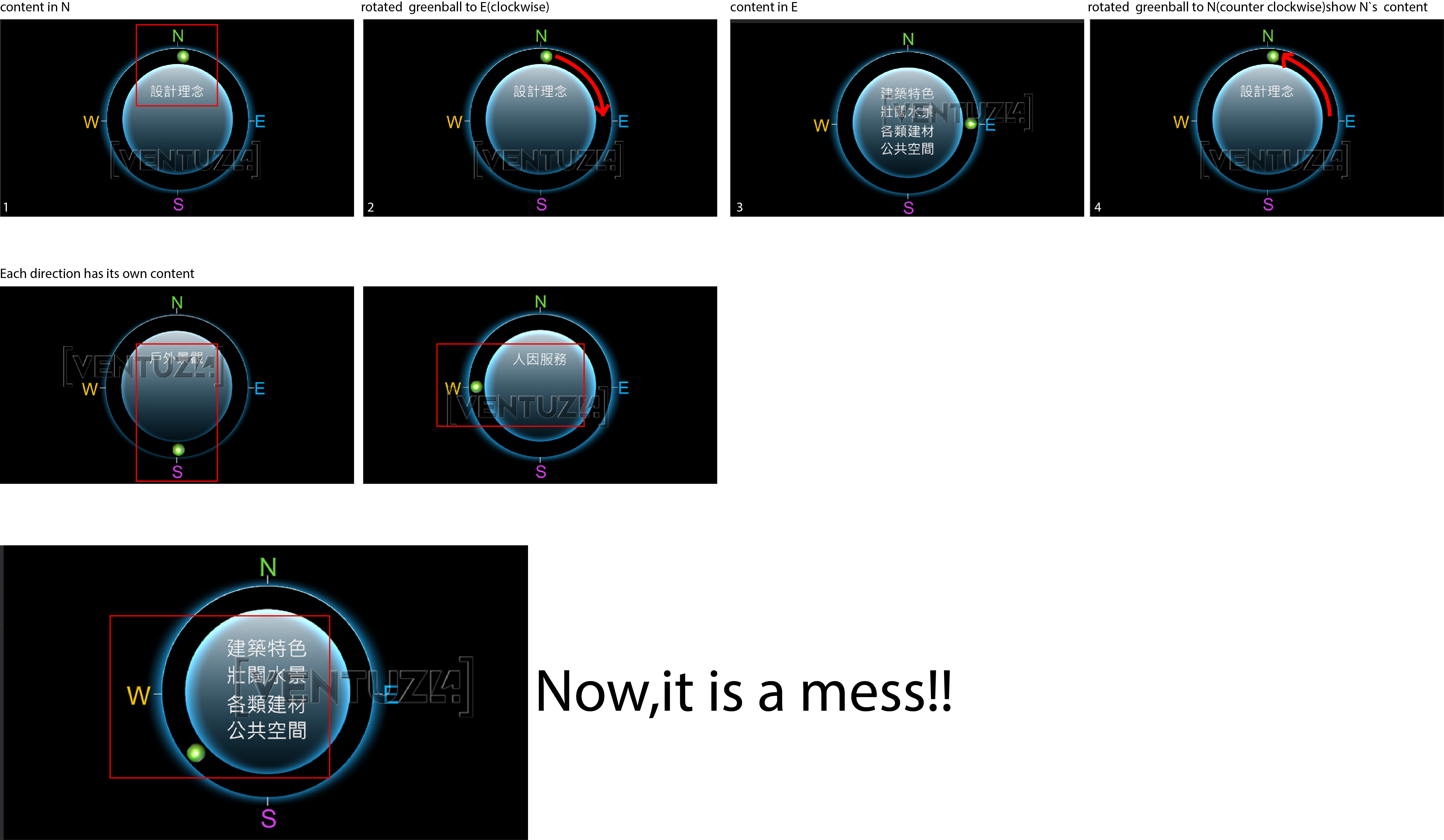We designed an interface like a compass,when rotated the green ball,each direction had it own data to show,no matter clockwise or counterclockwiser