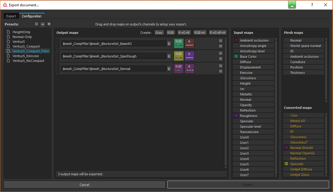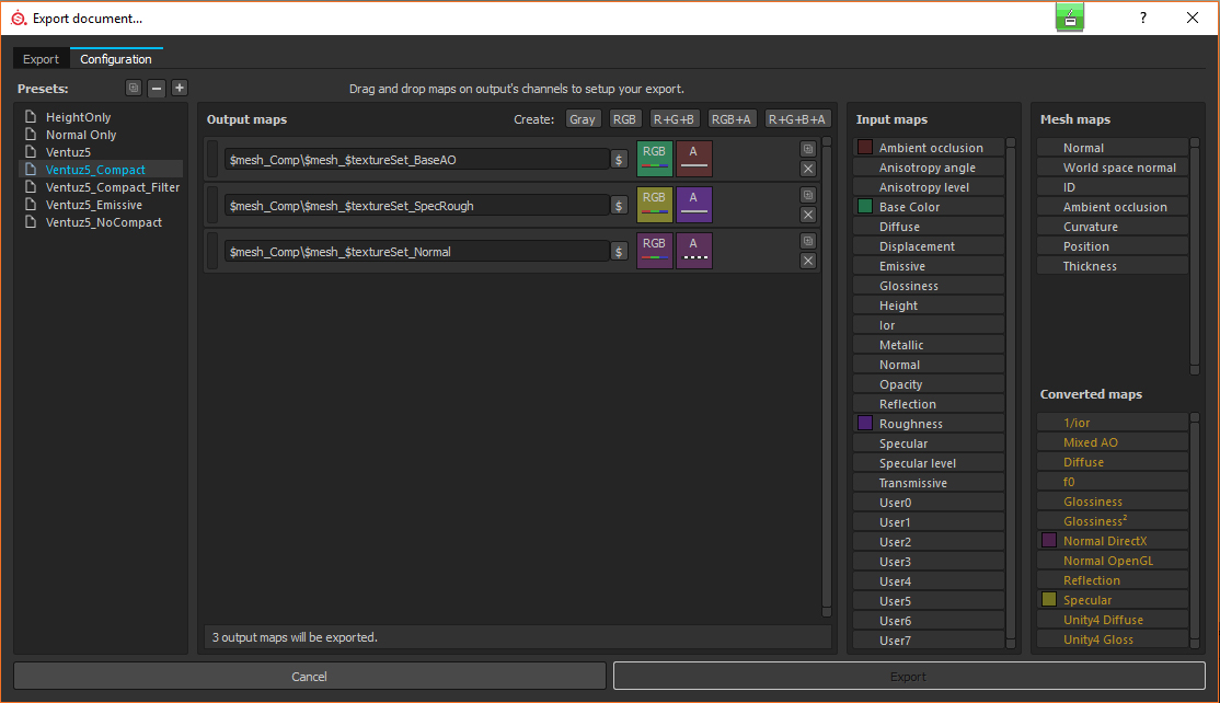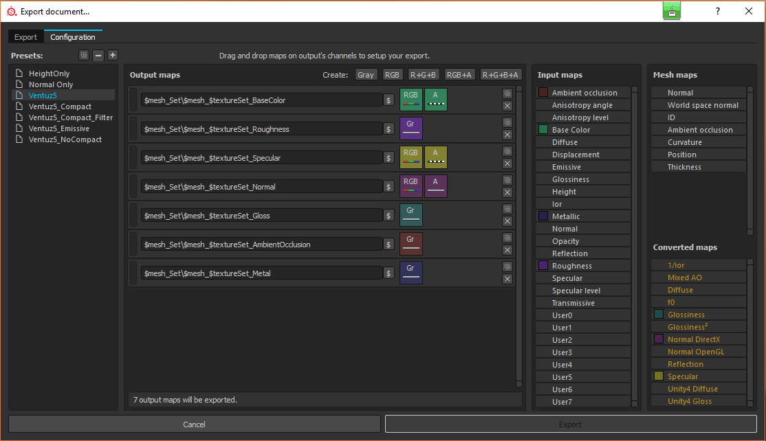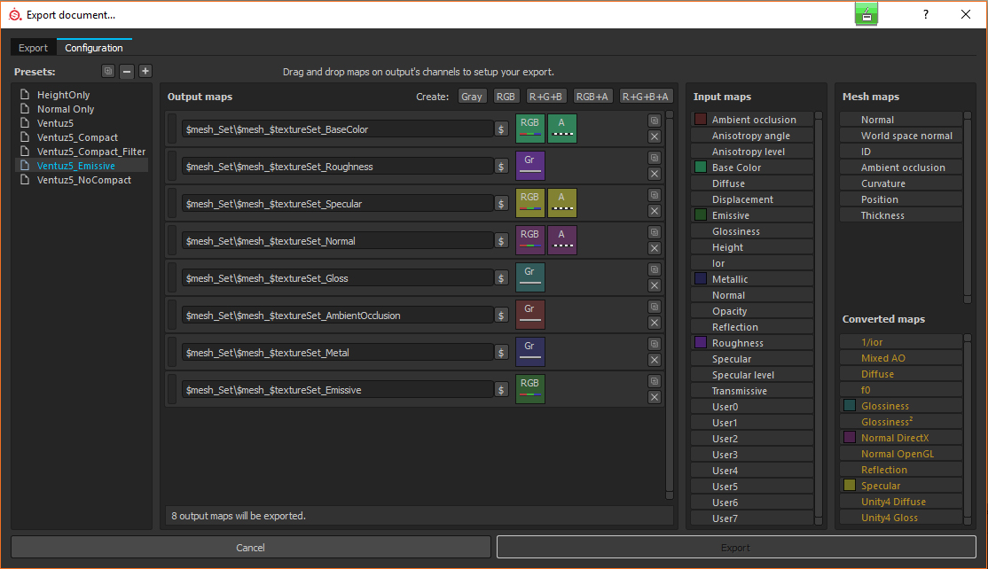 Ventuz5_emissive: This preset exports single maps, including the emissive channel.