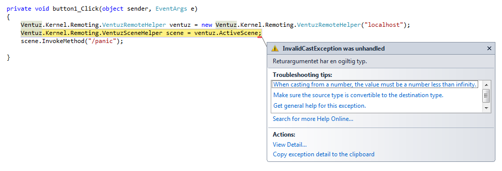 Attatched is the errormessage from VS and the corresponding logwindow from Ventuz.