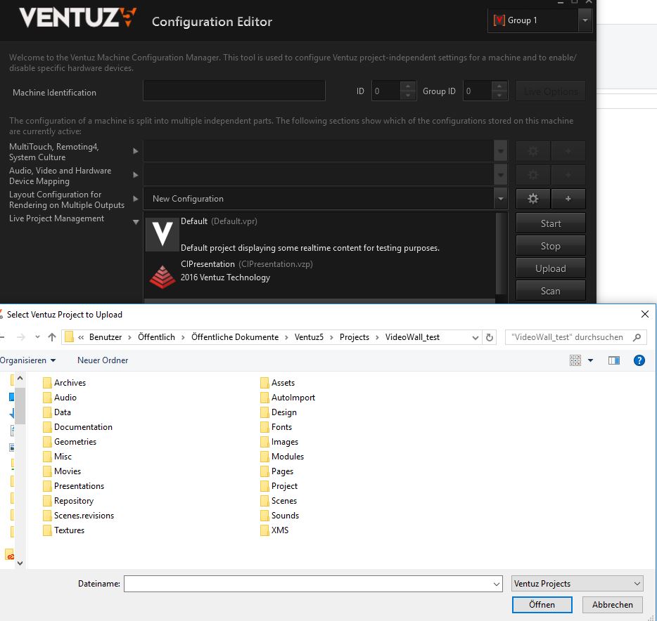 I created a group cluster with many monitors. Under that window i want to upload a new scene. Sadly this doenst work.