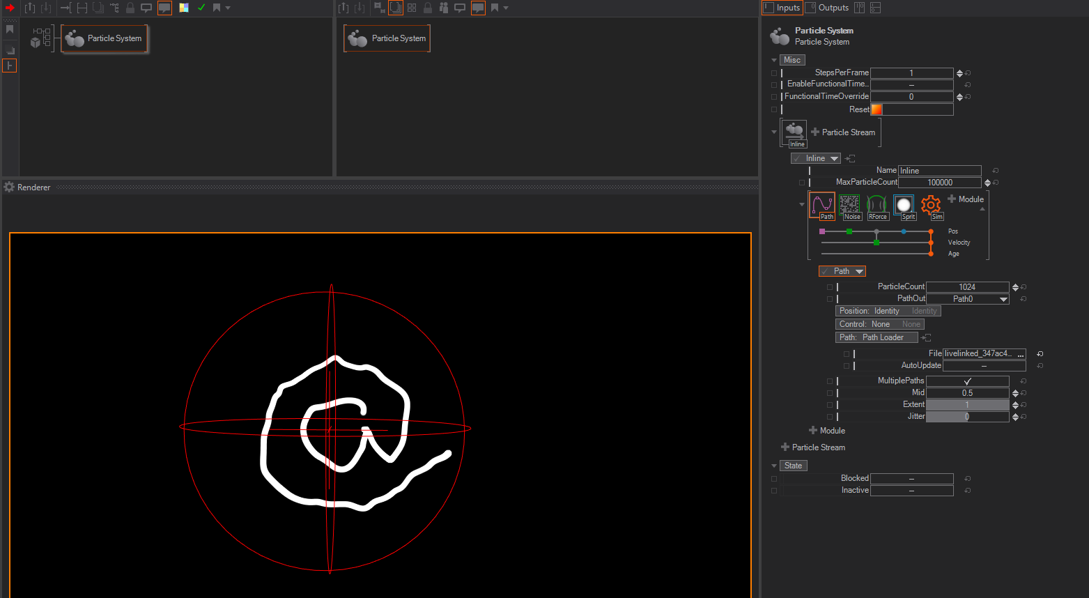 first create a Path in Cinema4D (can ba a spline created with the "pen" or a Text element). Make it a Child of a Null Node and apply the Ventuz Tags (Setup- and Object Tag) Now create a "Geometry Import Live" Node and link the "null" - click update and it will show this in the Heirarchy-, Content- and Properties Editor You can now make use of the Path and simply colorize it (since no material is applied you would need to apply a material and use the "Color - No Light" for example To use the Path later or for a Particle system its wise to save the whole scene one time, this will also generate and save VPATH inside of the ventuz structure in the geometry folder. You can rename or use the generated file and will find the correct name when you click the "Path Provider" inside the content editor You can create a Particle System with a "Path Emitter" and use the Spline there as well. Simply create a Particle System and add a "Emitter Module called PATH" Load the "VPATH File" and select "Ventuz 3D Path" Find it in the Geometry folder and select the correct VPATH to be loaded Now you can make use of the loaded VPath Emitter. USe it as a secondary stream or simply as it is