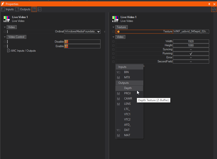 the Depth Output on the Live Video Node is meant for Ventuz' VIO Interface only, that supports composing of a scene of another 3D Engine into Ventuz. There is a VIO Node in Ventuz 6 for that, but the user can write their own Shader using the Output Textures of the Live Video Node.